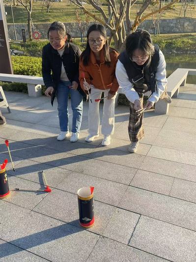 本次健步走路线贯穿新校区主要功能区域,沿途设置四个打卡点,分别位于21D教学楼前、东区网球场、4号楼门前篮球场和图书馆广场。每个打卡点精心设计了趣味互动环节,包括“你比我猜”、投篮、投壶和颠乒乓球等小游戏。教职工们积极参与,默契配合,在轻松愉快的氛围中完成各项挑战,集齐打卡印章。